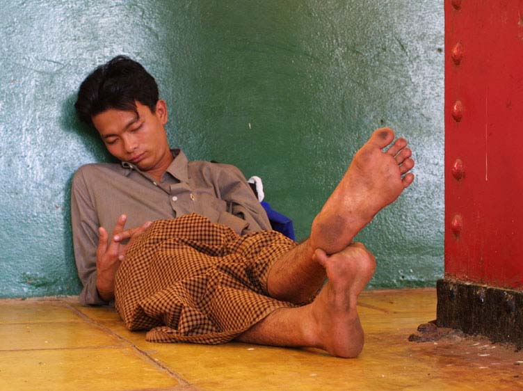 Man sleeps on giant sleeping buddha's base in Bago